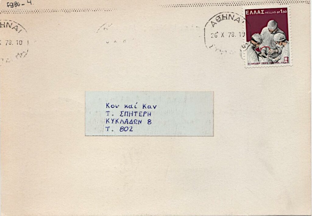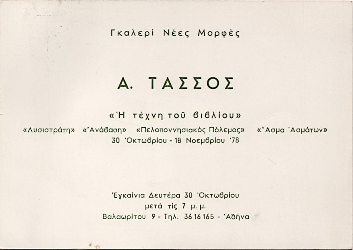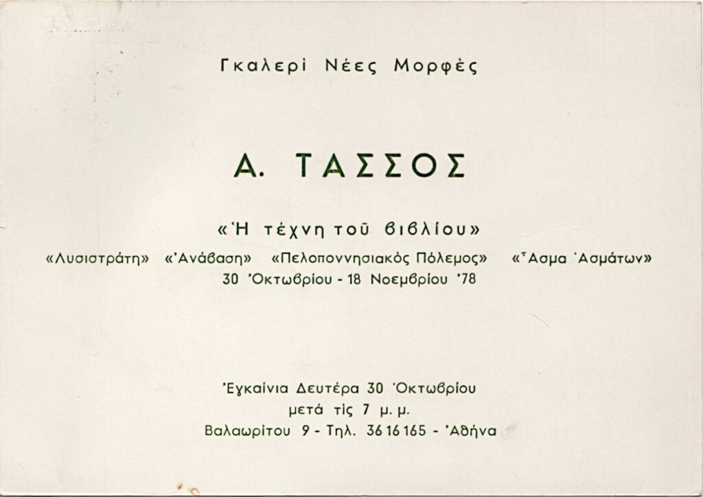 Invitation to the vernissage of the solo exhibition by the engraver Tassos titled “The Art of the Book: “Lysistrata,” Anabasis’, “Peloponnesian War,” ‘song of Songs,” in Athens, 1978, addressed to Toni and Ioanna Spiteris.