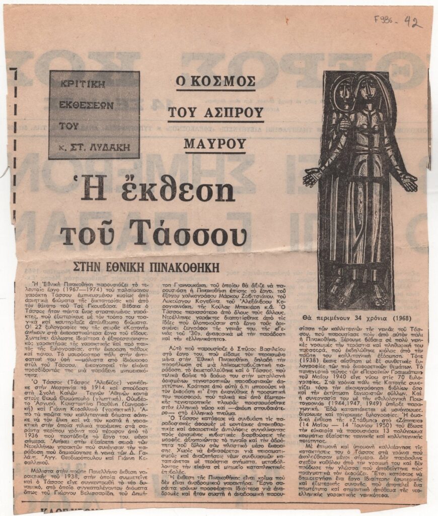 A newspaper clipping, featuring a review by St. Lydakis of the engraving exhibition by A. Tassos at the National Gallery in Athens.