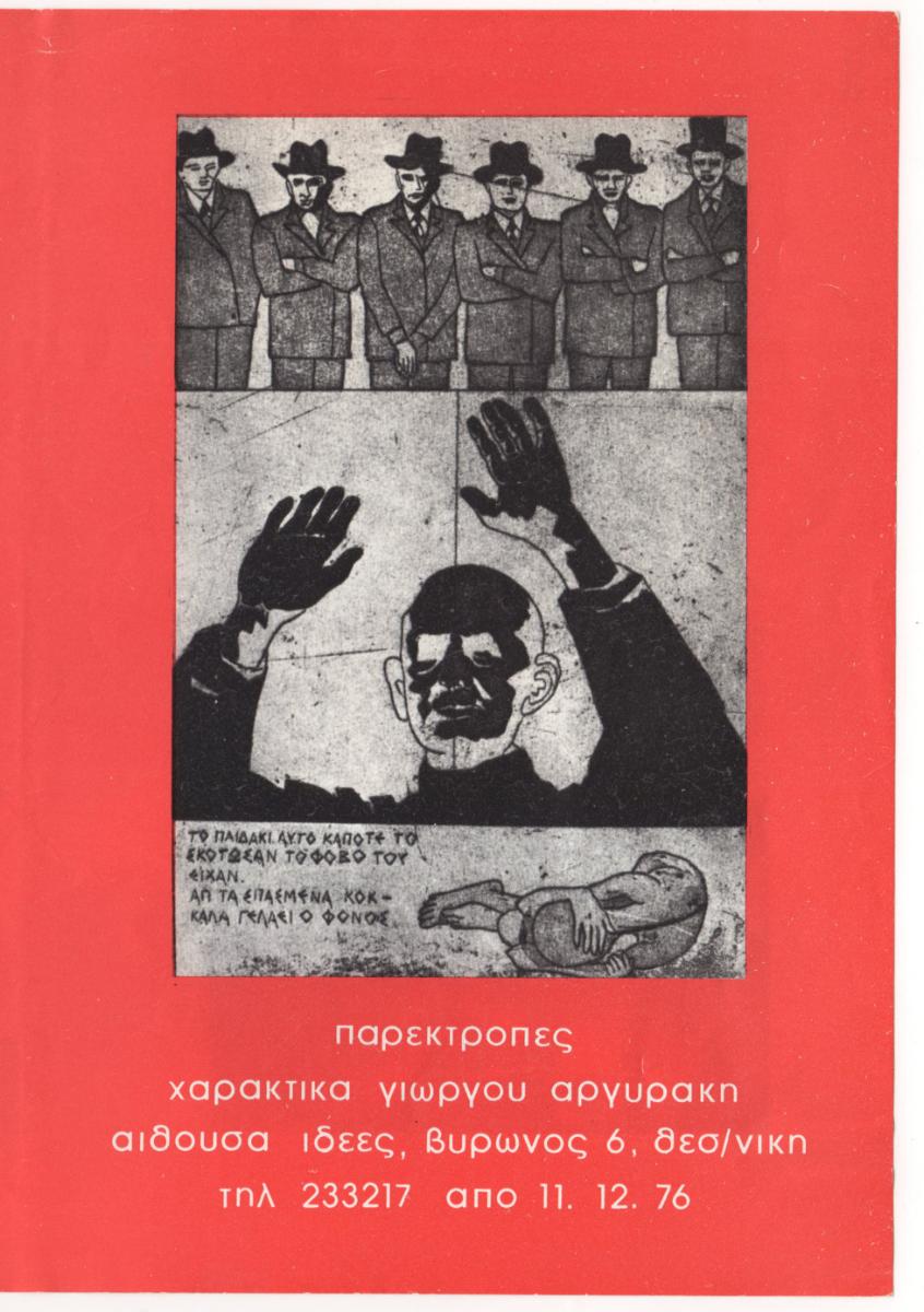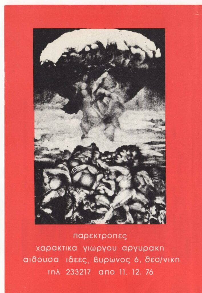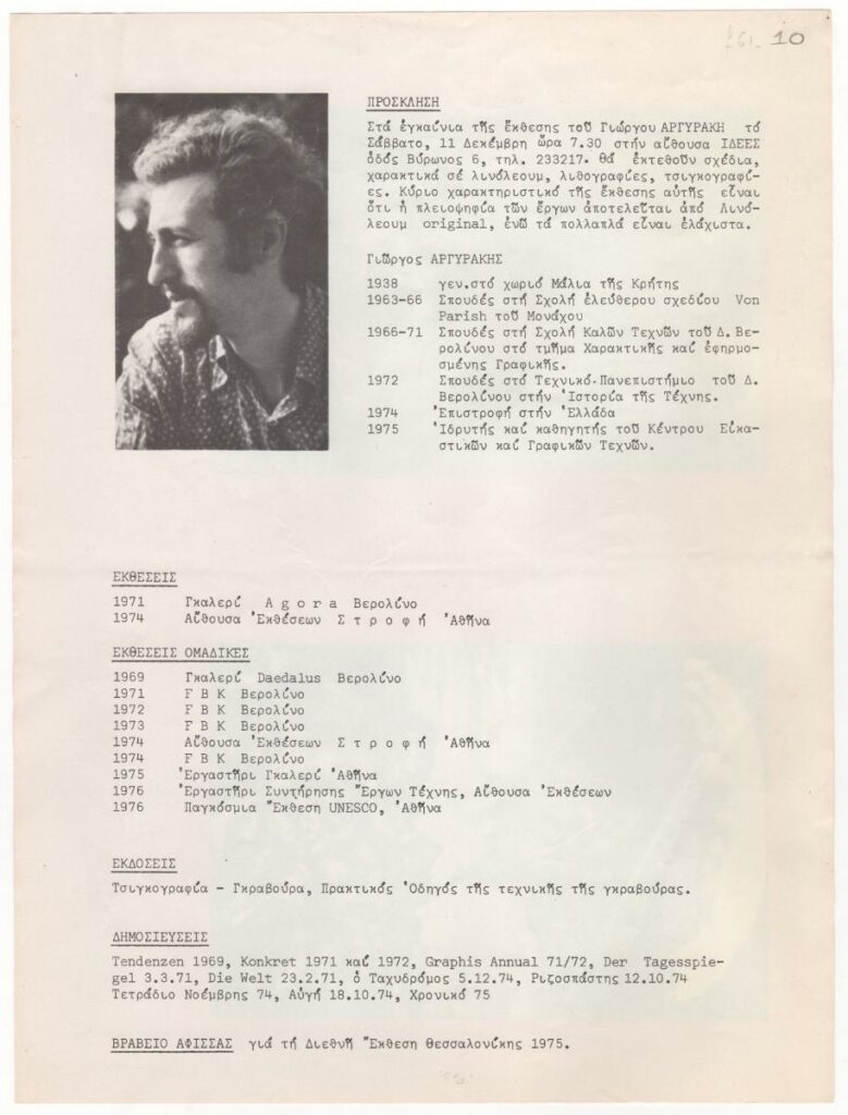 Invitation to the solo exhibition by printmaker Giorgos Argyrakis at the “Idees’ Exhibition Venue in Thessaloniki. It includes a brief biographical note, a list of his solo and group exhibitions, and a bibliography on the artist.