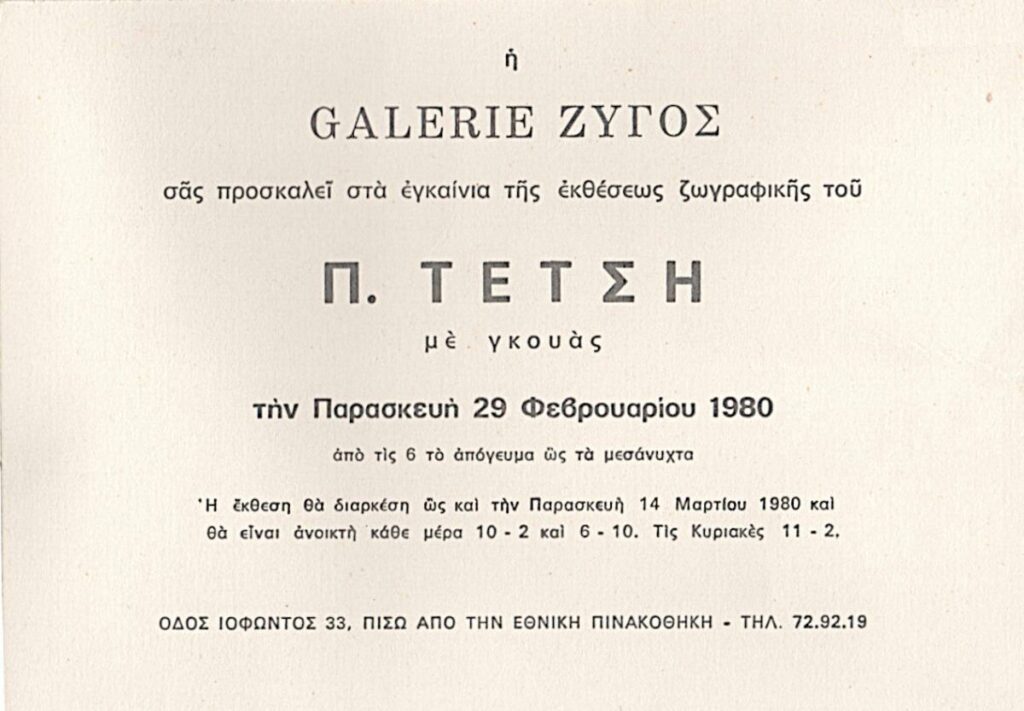 Invitation to the opening of the solo exhibition of Panagiotis Tetsis at the “Ora” Art and Culture Center in Athens.