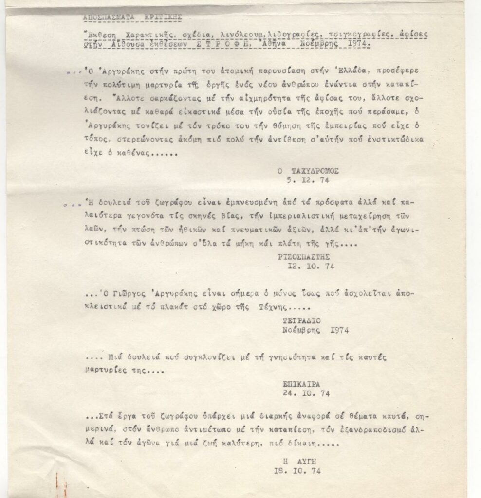 Typewritten document containing excerpts of reviews about the solo exhibition by the engraver Giorgos Argyrakis in Berlin, published in the international press and broadcast by the RIAS radio station of West Berlin on February 24, 1974. The document also includes excerpts from reviews of the artist’s solo exhibition in Athen.