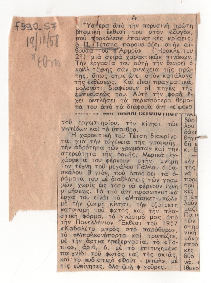 A clipping from the newspaper “To Ethnos”, dated November 19, 1958, featuring of aesthetic education in Greek education.