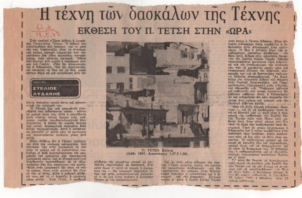 Clipping from the newspaper “Eleftheros Cosmos”, dated May 18, 1980, featuring a review by Stelios Lydakis of the solo painting exhibition of Panagiotis Tetsis at the “Ora” Art and Culture Center in Athens.