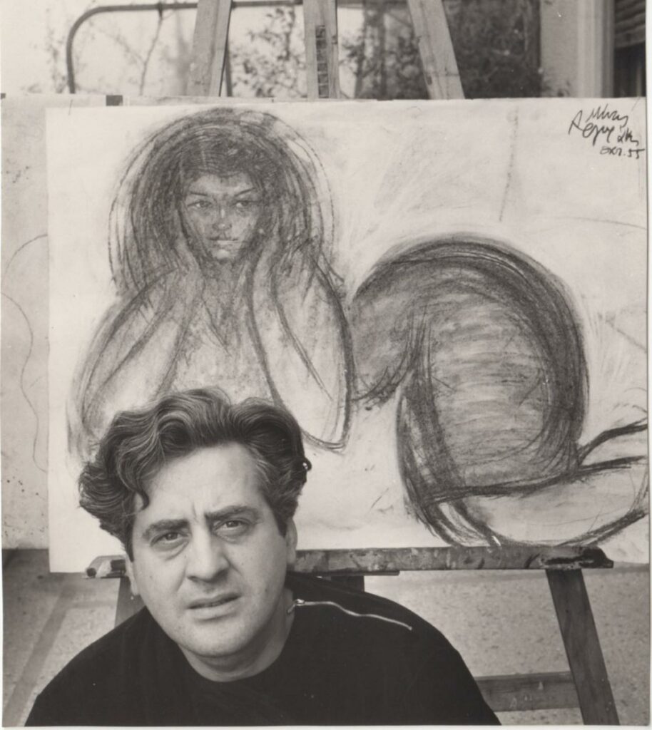 Black-and-white printed photograph of the painter Minos Argyrakis in front of his artwork. On the reverse, there is a handwritten inscription.