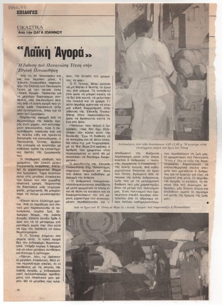 Clipping from the magazine “Epikaira”, dated February 3, 1983, featuring a review by Olga Ioannou of the solo exhibition of works by Panagiotis Tetsis at the National Gallery, titled “Flea Market”.