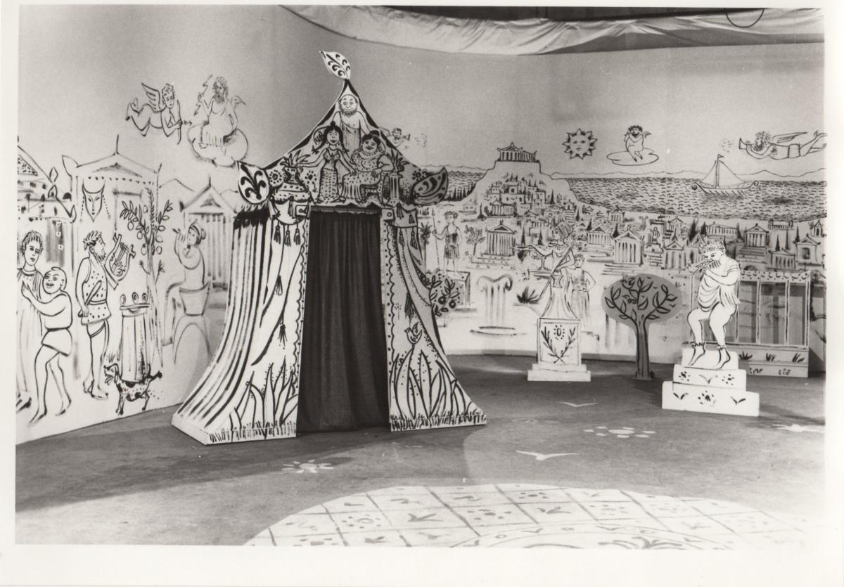 Black-and-white printed photograph of a scenic design by Minos Argyrakis, likely from the television production of Menander’s comedy ‘Samia’ by R.I.K., directed by Evi Gavrielides in 1972.