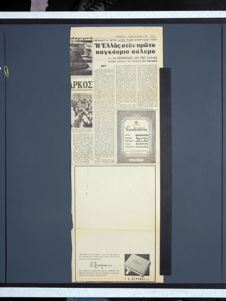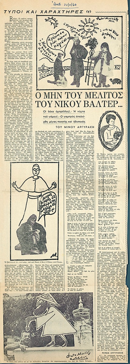 A clipping from the newspaper “Eleftheria”, dated November 22, 1964, featuring an illustrated humorous piece by Minos Argyrakis.