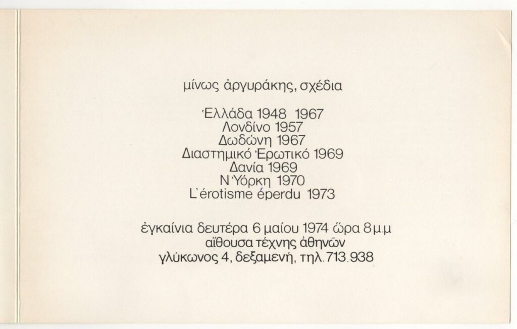 Invitation to the vernissage of Minos Argyrakis’ solo exhibition at the Athens Art Gallery in 1974. The exhibition features works from the thematic collections: Greece 1948–1967, London 1957, Dodoni 1967, Space Erotic 1969, Denmark 1969, New York 1970, and “L”érotisme éperdu 1973”. On the reverse, appears a brief biographical note.