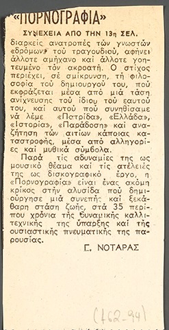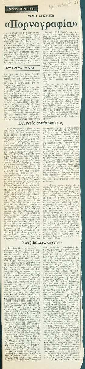 A clipping from the newspaper “I Kathimerini”, dated January 30, 1989, featuring a review of the disc that resulted from the performance of the work “Pornography” by Manos Hadjidakis.
