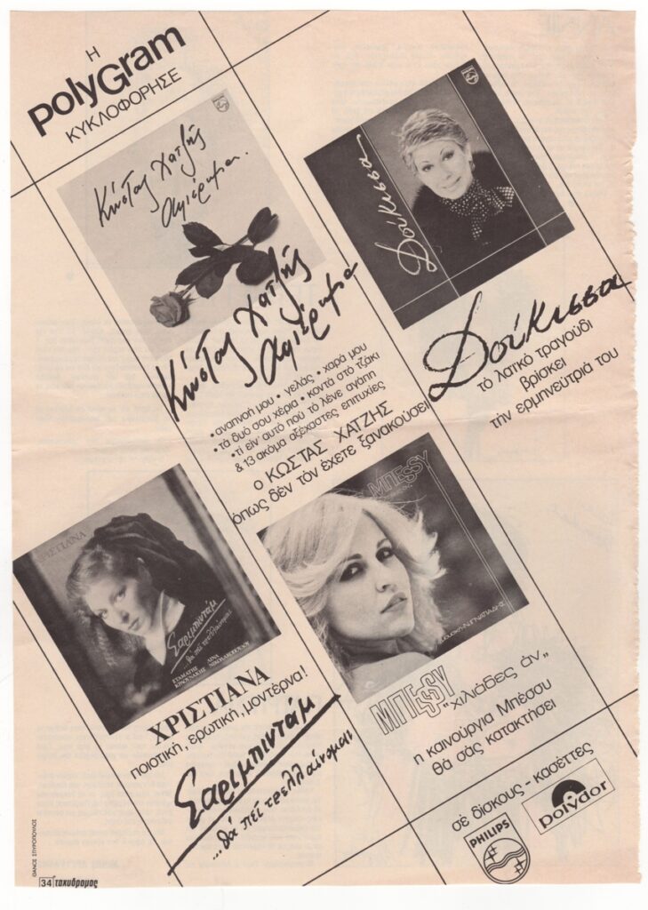 Vassiliou Spyros (1902 - 1985) ; Kalligas Marinos (1906 - 1985) ; Chatzifotiou Zachos (1923 - 2022) ; Argyrakis Minos (1920 - 1998) ; Savvopoulos Dionysis (1944) ; Παύλος Καλλιγάς ; Ελένη Μυλωνά (1944) ; Ελένη Καλλιγά ; Άσπα Σαββοπούλου ; Κατερίνα Κουτσίνα ; Σέρο Αμπραχαμιάν (1950 - 1983) ; Φίλιππος Ιωαννίδης ; Αλέκος Πατσιφάς ; Αλέξης Χατζημιχάλης
