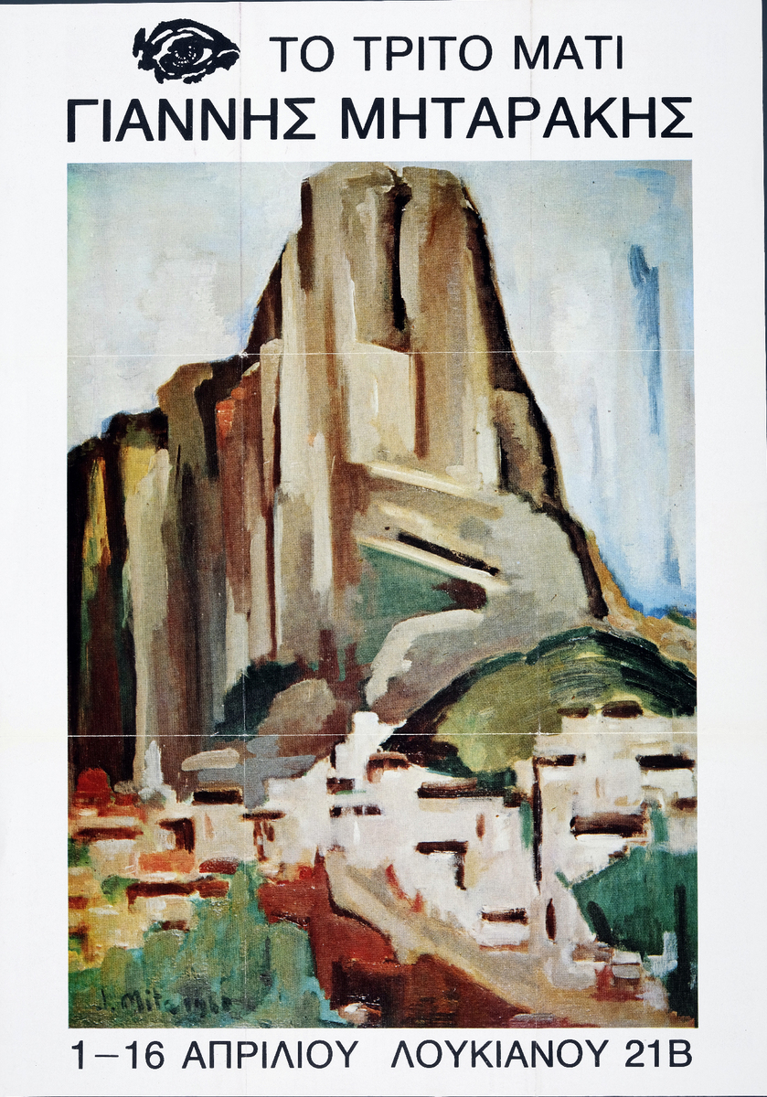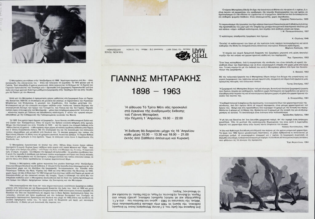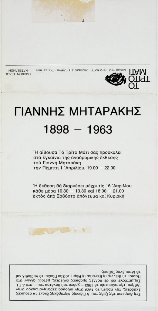Invitation to the vernissage of Yannis Mitarakis’ retrospective painting exhibition in Athens. The reverse features a biographical note about the artist and excerpts from reviews in daily and periodical publications.
