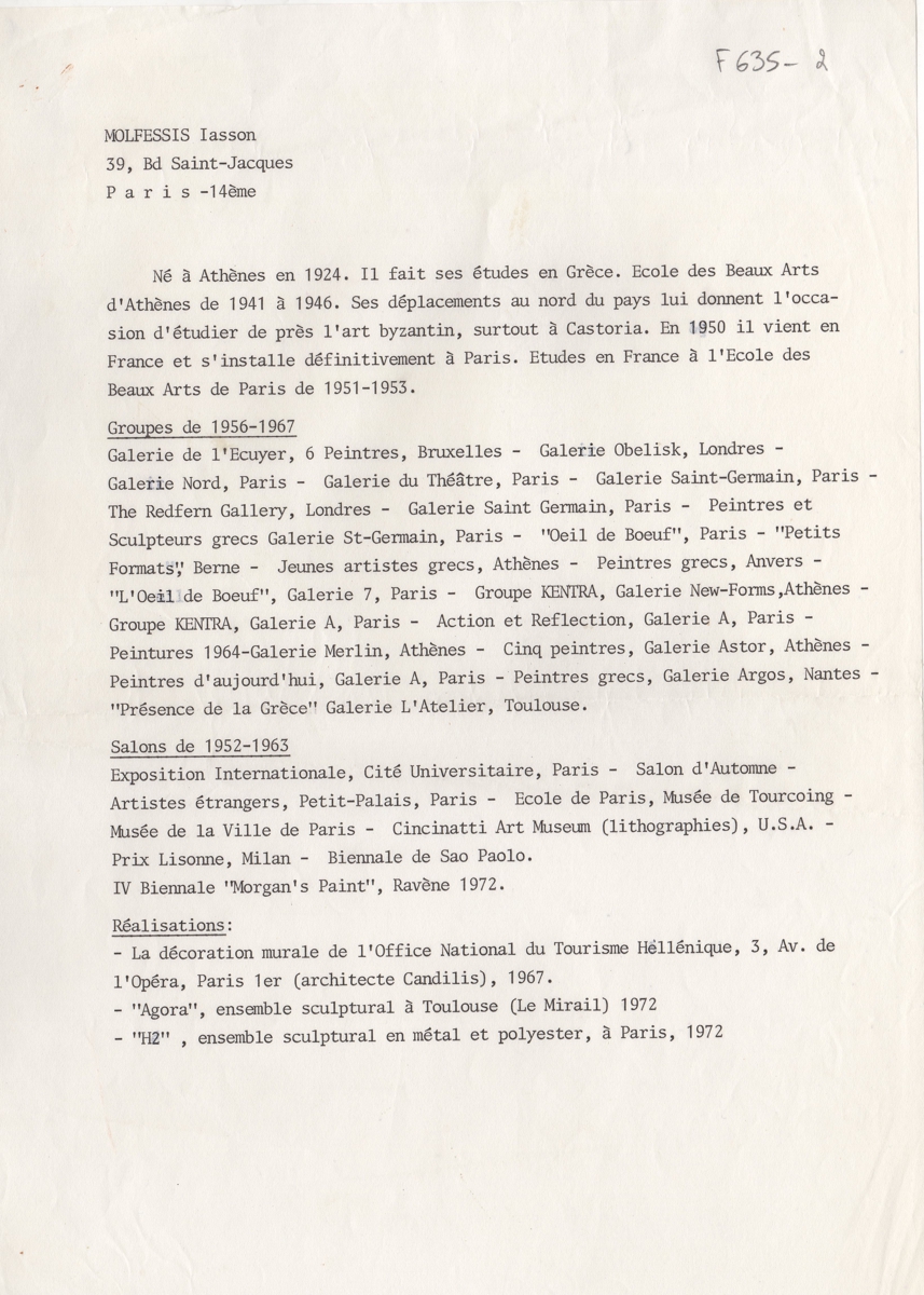 Andreou Kostas (1917 - 2007) ; Fatouros Dimitris (1928 - 2020) ; Spiteri-Veropoulou Ioanna (1920 - 2000) ; Eugène Delacroix (1798 - 1863) ; Touyas Giorgos (1922 - 1994) ; Simossi Gabriela (1926 - 1999) ; Tsoclis Costas (1930) ; Sklavos Yerassimos (1927 - 1967) ; Άγγελος Αγγελόπουλος (1904 - 1995) ; Kontopoulos Alekos (1904 - 1975) ; Mylonas Alex (1923 - 2016) ; Vyzantios Ntikos (1924 - 2007) ; Berto Lardera ; Valsamis Kostas (1908 - 2003) ; Gaitis Yannis (1923 - 1984) ; Le Corbusier (1887 - 1965) ; Georges Mathieu (1921 - 2012) ; Theodoros (Papadimitriou) (1931 - 2018) ; Takis (Vassilakis Panayiotis) (1925 - 2019) ; Victor Vasarely ; Philolaos (Tloupas) (1923 - 2010) ; Kessanlis Nikos (1930 - 2004) ; Kriezi Tita (1930 - 2021) ; Lyberaki Aglaia (1923 - 1985) ; Maltezos Yannis (1915 - 1987) ; Molfesis Iasson (1925 - 2009) ; Paniaras Kostas (1934 - 2014) ; Karras Kostas (1936 - 2012) ; Γιώργος Βαφειάδης