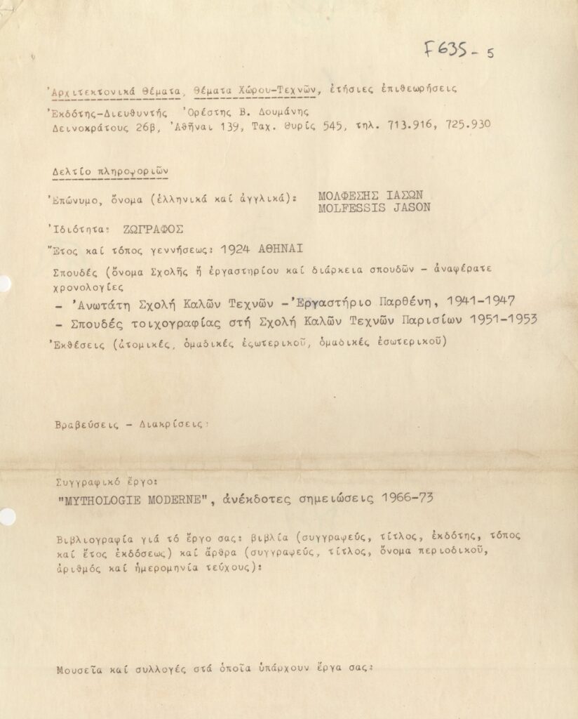 Spiteri-Veropoulou Ioanna (1920 - 2000) ; Vafeiadis Markos (1906 - 1992) ; Raftopoulou Bella (1902 - 1992) ; Pavlos (Dionyssopoulos) (1930 - 2019) ; Christoforou John (1921 - 2014) ; Fassianos Alekos (1935 - 2022) ; Μανώλης Καλλιγιάννης ; Simossi Gabriela (1926 - 1999) ; Tsarouchis Yannis (1910 - 1989) ; Tsoclis Costas (1930) ; (Panagopoulos) Daniel (1924 - 2008) ; Koulentianos Kostas (1918 - 1995) ; Vyzantios Ntikos (1924 - 2007) ; Tzolaki Rena (1930) ; Angelopoulos Aristomenis (1900 - 1990) ; Philolaos (Tloupas) (1923 - 2010) ; Fokas Yannis (1951) ; Κώστας Χαραλαμπίδης (1946) ; Pierrakos Alkis (1920 - 2017) ; Sperantzas Vassilis (1938) ; Karavouzis Sarantis (1938 - 2011) ; Yulika Lakeridou (1940) ; Kindynis Anna (1914 - 2003) ; Kriezi Tita (1930 - 2021) ; Lyberaki Aglaia (1923 - 1985) ; Κώστας Μακρής ; Maltezos Yannis (1915 - 1987) ; Molfesis Iasson (1925 - 2009) ; Κωνσταντίνος Μόραλης ; Bouteas Yannis (1941 - 2026) ; Xenakis Constantinos (1931 - 2020) ; Pastra Nausica (1921 - 2011) ; Gisele Πράσινου ; Tsekoura, Vassiliki (1947) ; Πάνος Ελευθερίου ; Δημήτρης Ράτσικας (1946) ; Νίκος Δαμιανάκης (1920 - 2005) ; Pantelias Miltos (1954) ; Νίκος Τσιώτης ; Εριέττα Βορδώνη (1959) ; Κωνσταντίνος Γιαννικούρης