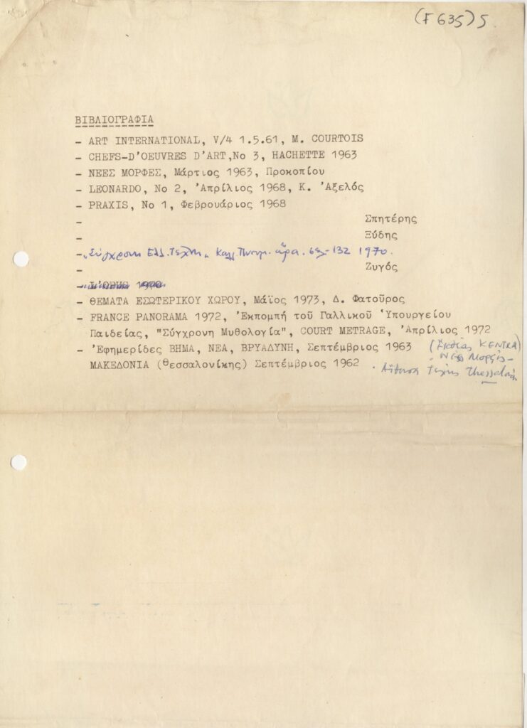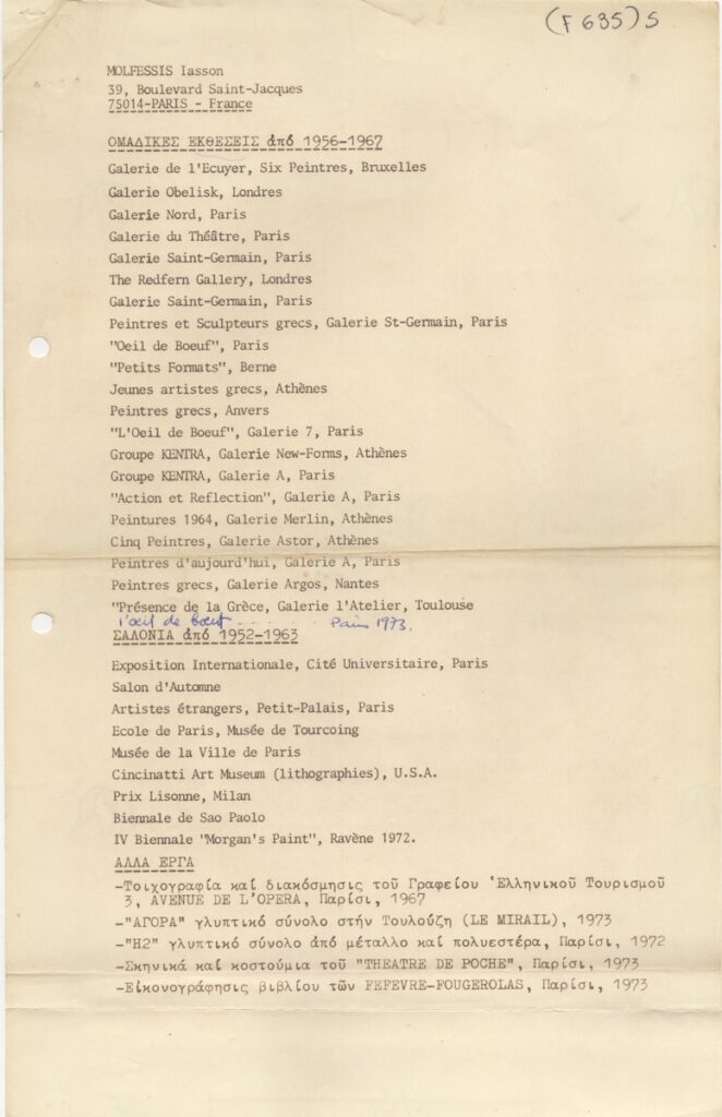 Andreou Kostas (1917 - 2007) ; Fatouros Dimitris (1928 - 2020) ; Spiteri-Veropoulou Ioanna (1920 - 2000) ; Eugène Delacroix (1798 - 1863) ; Touyas Giorgos (1922 - 1994) ; Simossi Gabriela (1926 - 1999) ; Tsoclis Costas (1930) ; Sklavos Yerassimos (1927 - 1967) ; Άγγελος Αγγελόπουλος (1904 - 1995) ; Kontopoulos Alekos (1904 - 1975) ; Mylonas Alex (1923 - 2016) ; Vyzantios Ntikos (1924 - 2007) ; Berto Lardera ; Valsamis Kostas (1908 - 2003) ; Gaitis Yannis (1923 - 1984) ; Le Corbusier (1887 - 1965) ; Georges Mathieu (1921 - 2012) ; Theodoros (Papadimitriou) (1931 - 2018) ; Takis (Vassilakis Panayiotis) (1925 - 2019) ; Victor Vasarely ; Philolaos (Tloupas) (1923 - 2010) ; Kessanlis Nikos (1930 - 2004) ; Kriezi Tita (1930 - 2021) ; Lyberaki Aglaia (1923 - 1985) ; Maltezos Yannis (1915 - 1987) ; Molfesis Iasson (1925 - 2009) ; Paniaras Kostas (1934 - 2014) ; Karras Kostas (1936 - 2012) ; Γιώργος Βαφειάδης