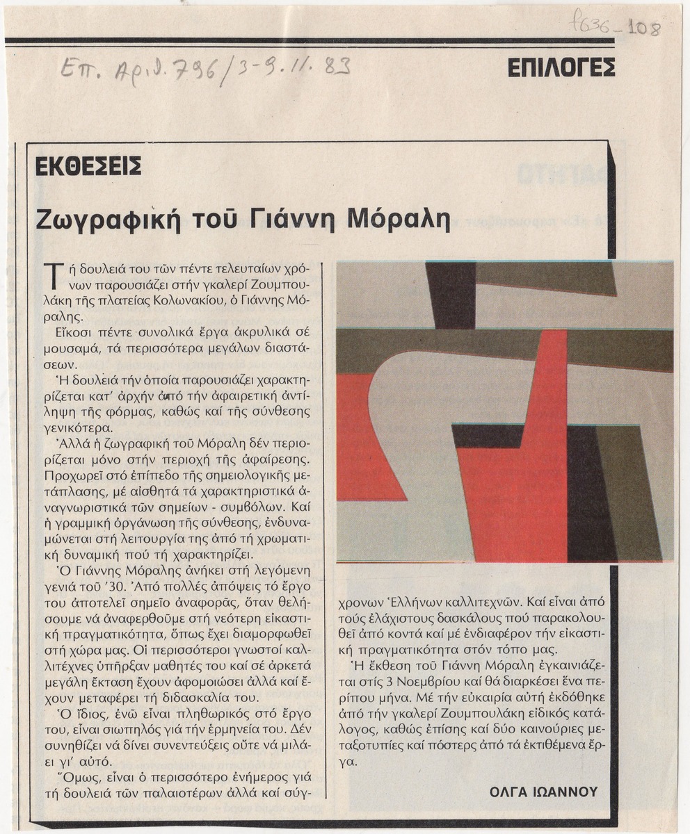 A clipping from the magazine “Epikaira”, dated November 3, 1983, featuring a review of the solo exhibition by the painter Yiannis Moralis at the Zoumboulakis Gallery, in Athens.