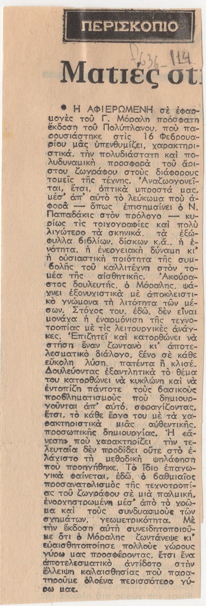 A clipping from the newspaper “I Kathimerini”, featuring an article about the release of an art book dedicated to Yannis Moralis by the Polyplano Art Gallery.