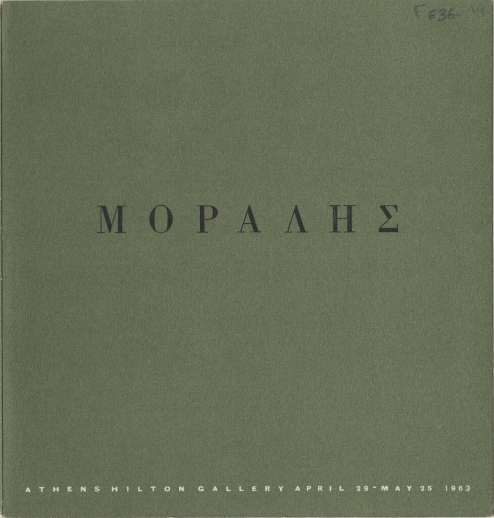 Pamphlet for a solo exhibition by the painter Yannis Moralis at the Athens Exhibition Venue – Hilton in Athens. It contains a list of works exhibited in chronological order, a biographical note of the artist and an illustration.