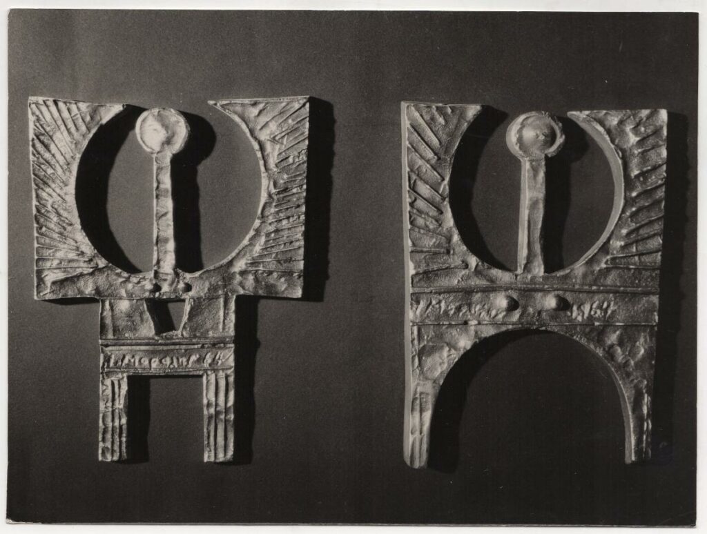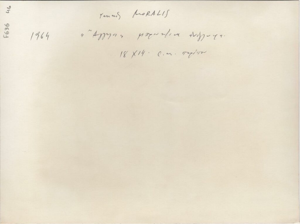 Black-and-white printed photograph of an artwork by Yiannis Moralis. On the reverse, inscription.