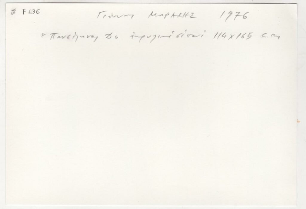 Black-and-white printed photograph of an artwork by Yiannis Moralis. On the reverse, inscription.