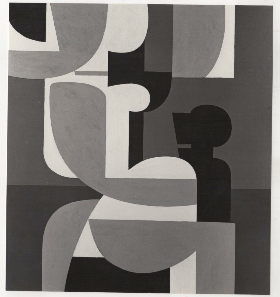 Black-and-white printed photograph of an artwork by Yiannis Moralis. On the reverse, inscription.