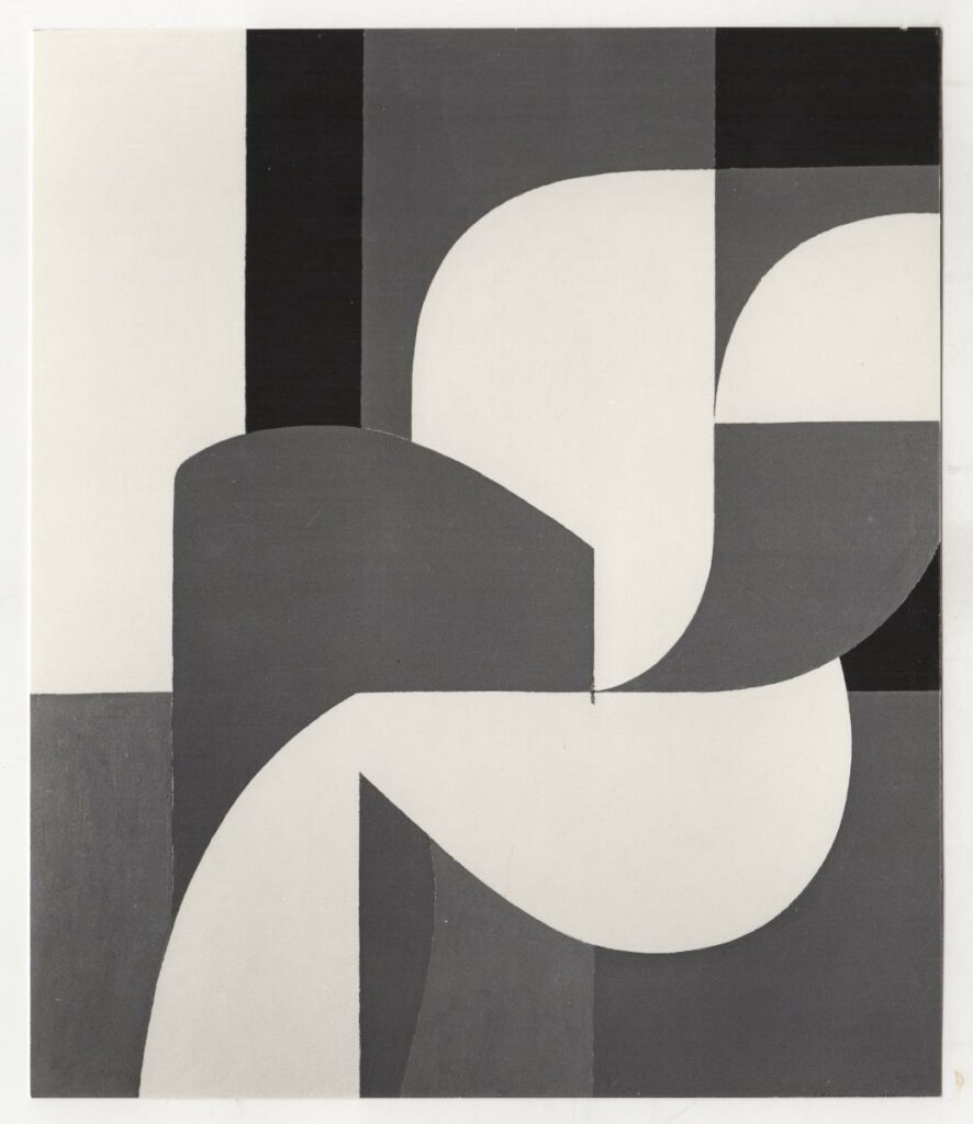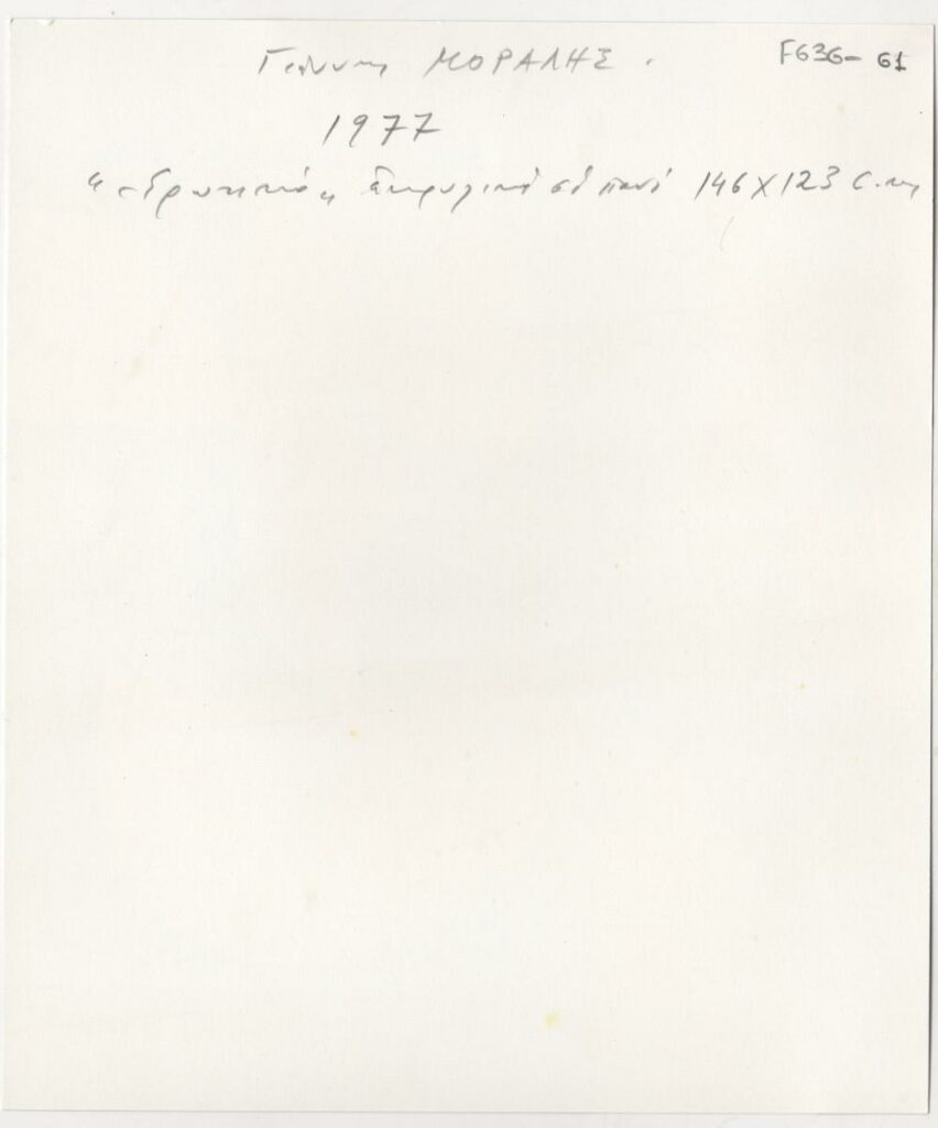 Black-and-white printed photograph of an artwork by Yiannis Moralis. On the reverse, inscription.