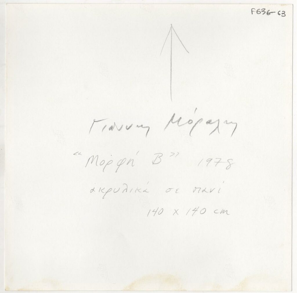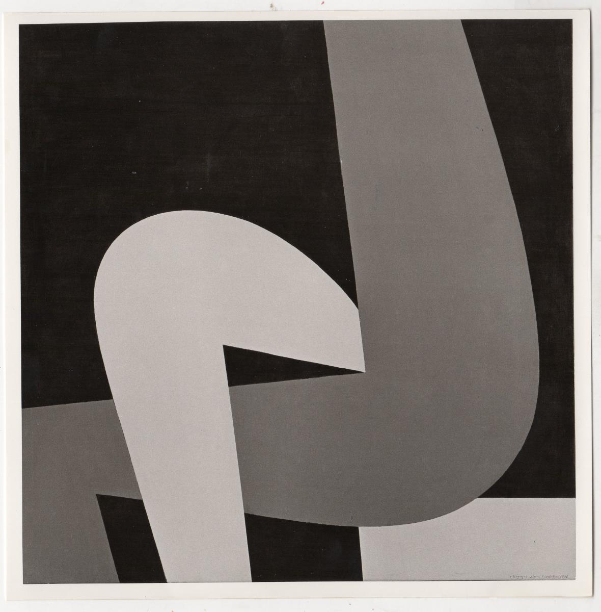 Black-and-white printed photograph of an artwork by Yiannis Moralis. On the reverse, inscription.