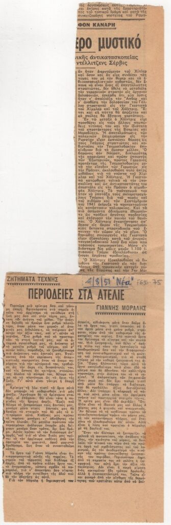 A clipping from the newspaper “Ta Nea”, dated August 4, 1951, featuring a review of the work of the painter Yiannis Moralis.