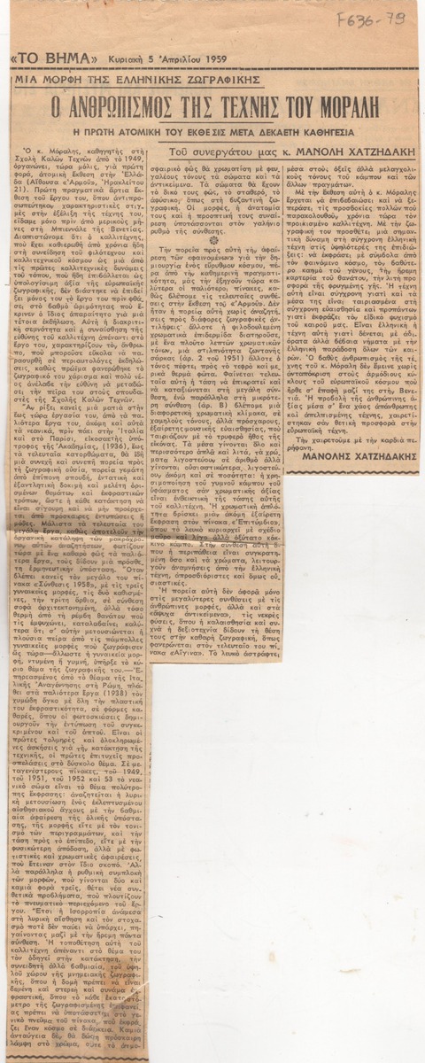 A clipping from the newspaper “To Vima”, dated April 5, 1959, featuring a review of the exhibition by Yiannis Moralis at the “Armos’ Art Gallery in Athens.