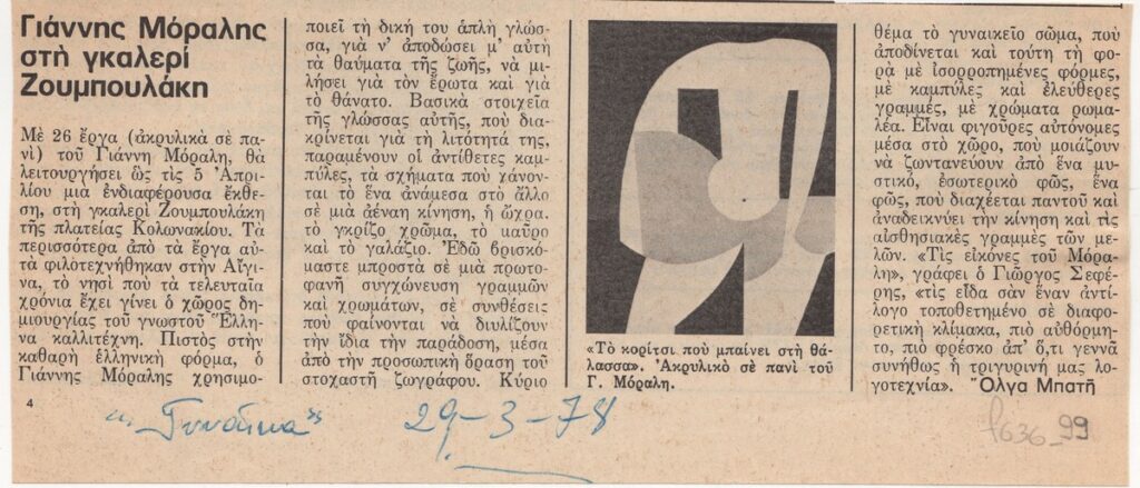 A clipping from the magazine “Gynaika”, dated March 29, 1978, featuring a review of the solo exhibition by Yiannis Moralis at the Zoumboulakis Gallery in Athens.