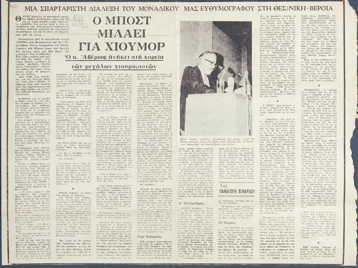 A clipping from the newspaper “Avgi”, dated May 22, 1977, featuring an article about a lecture on humor given by the cartoonist, visual artist and author Bost (Mentis Bostantzoglou) in Thessaloniki and Veria (Greece)