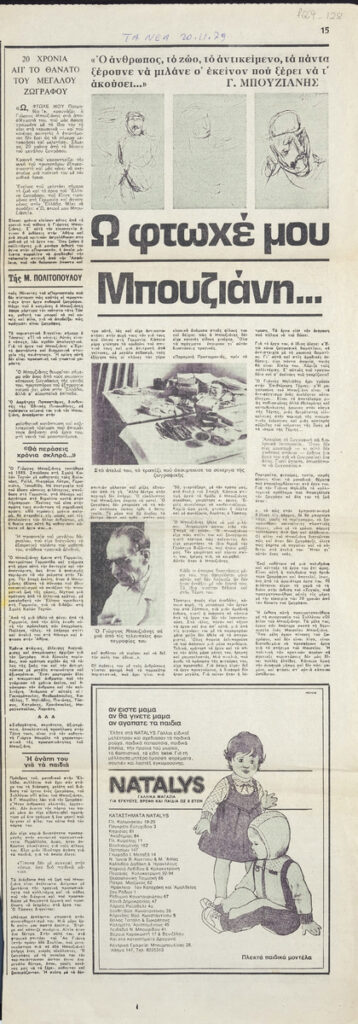 A clipping from the newspaper “Ta Nea”, dated November 20, 1979, featuring an article on the life and work of the painter Giorgos Bouzianis on the occasion of the 20th anniversary of his death. It includes excerpts from an interview with the artist.