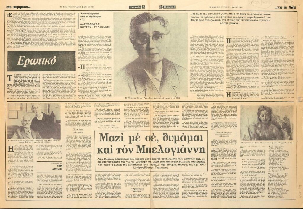 A clipping from the newspaper “To Vima”, dated May 3, 1981, featuring an interview by author Alexandra Kottou-Graikiotis with Lena Doukidis about the story of her twin sister, Lisa Kottou, and her romantic relationship with painter Giorgos Bouzianis.