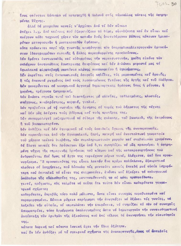 Andreou Kostas (1917 - 2007) ; Fatouros Dimitris (1928 - 2020) ; Spiteri-Veropoulou Ioanna (1920 - 2000) ; Eugène Delacroix (1798 - 1863) ; Touyas Giorgos (1922 - 1994) ; Simossi Gabriela (1926 - 1999) ; Tsoclis Costas (1930) ; Sklavos Yerassimos (1927 - 1967) ; Άγγελος Αγγελόπουλος (1904 - 1995) ; Kontopoulos Alekos (1904 - 1975) ; Mylonas Alex (1923 - 2016) ; Vyzantios Ntikos (1924 - 2007) ; Berto Lardera ; Valsamis Kostas (1908 - 2003) ; Gaitis Yannis (1923 - 1984) ; Le Corbusier (1887 - 1965) ; Georges Mathieu (1921 - 2012) ; Theodoros (Papadimitriou) (1931 - 2018) ; Takis (Vassilakis Panayiotis) (1925 - 2019) ; Victor Vasarely ; Philolaos (Tloupas) (1923 - 2010) ; Kessanlis Nikos (1930 - 2004) ; Kriezi Tita (1930 - 2021) ; Lyberaki Aglaia (1923 - 1985) ; Maltezos Yannis (1915 - 1987) ; Molfesis Iasson (1925 - 2009) ; Paniaras Kostas (1934 - 2014) ; Karras Kostas (1936 - 2012) ; Γιώργος Βαφειάδης