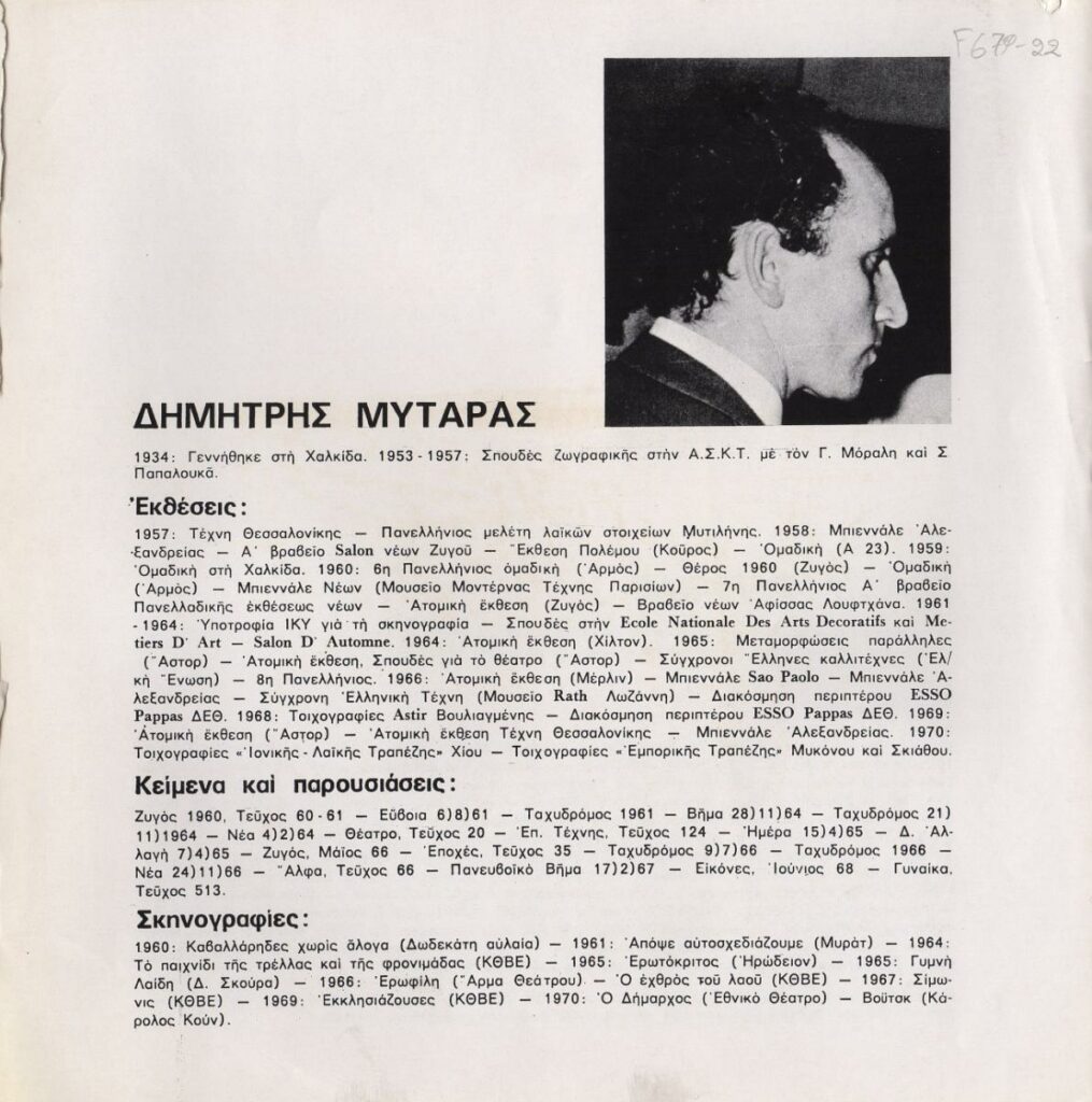 A clipping from an pamphlet for an exhibition of paintings by Dimitris Mytaras. It contains the artist’s biographical note, references in the bibliography and scenographic activity.