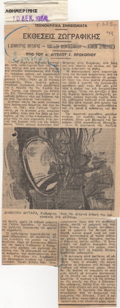A clipping from the newspaper “I Kathimerini”, featuring an article on the Dimitris Mytaras solo exhibition at the Athens Hilton Art Gallery.