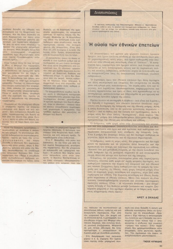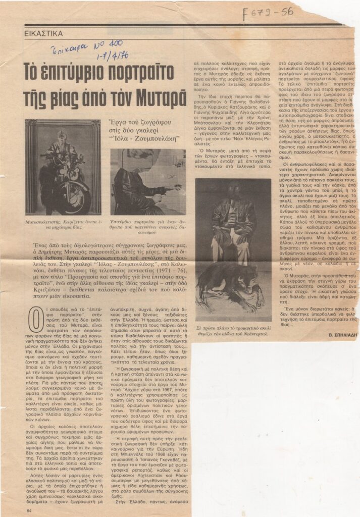 A clipping from the magazine “Epikaira”, dated April 1, 1976, featuring a review of the Dimitris Mytaras solo exhibition held in the Zoumboulakis Gallery in Athens.