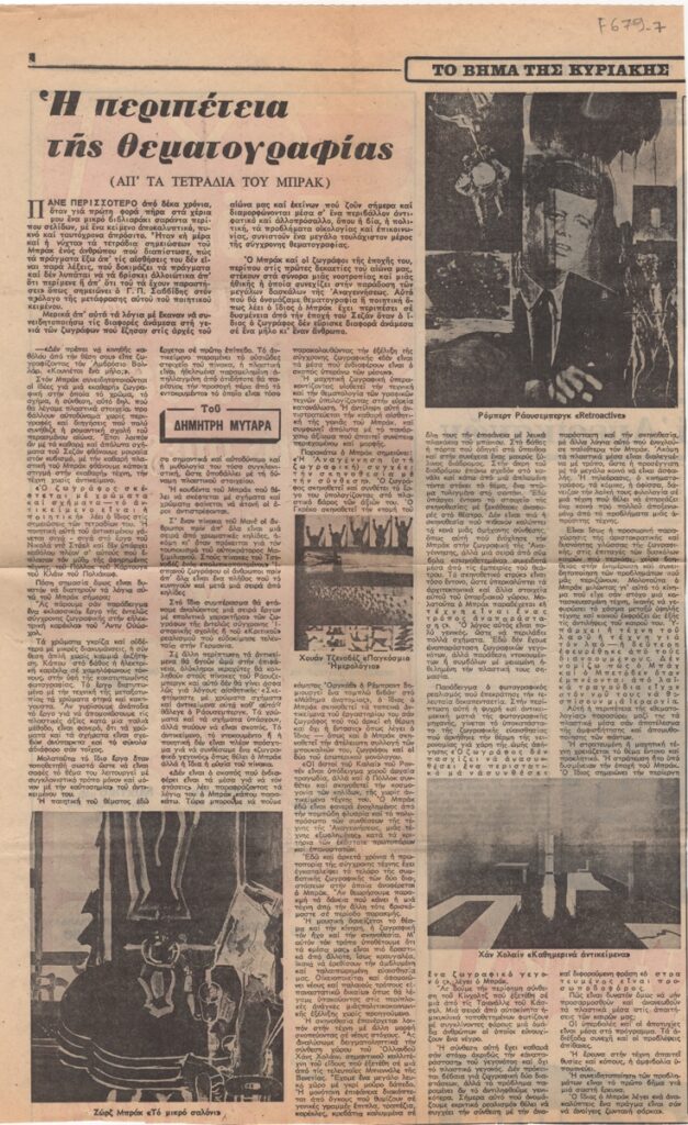 A clipping from the newspaper “To Vima”, dated July 31, 1977, featuring a text by the painter Dimitris Mytaras stating his reactions on reading Braque’s “Notebooks’, regarding “thematography”, as defined by the latter. Mytaras refers to the artist’s works and gives examples.