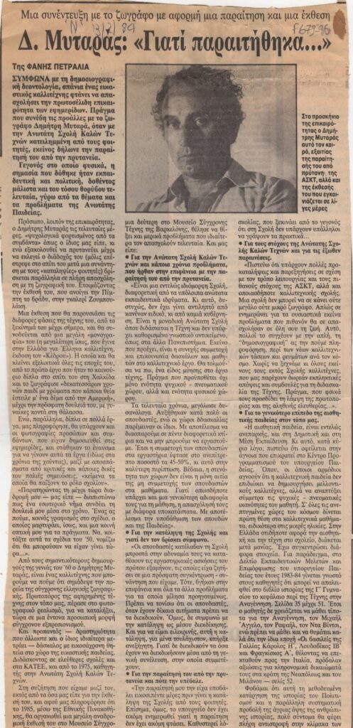 An clipping from the newspaper “Ta Nea”, dated February 13, 1984, featuring an interview with the painter Dimitris Mytaras regarding his resignation from the position of Rector at School of Fine Arts of the Athens University as well as solo exhibition at the Zoumboulakis gallery in Athens.