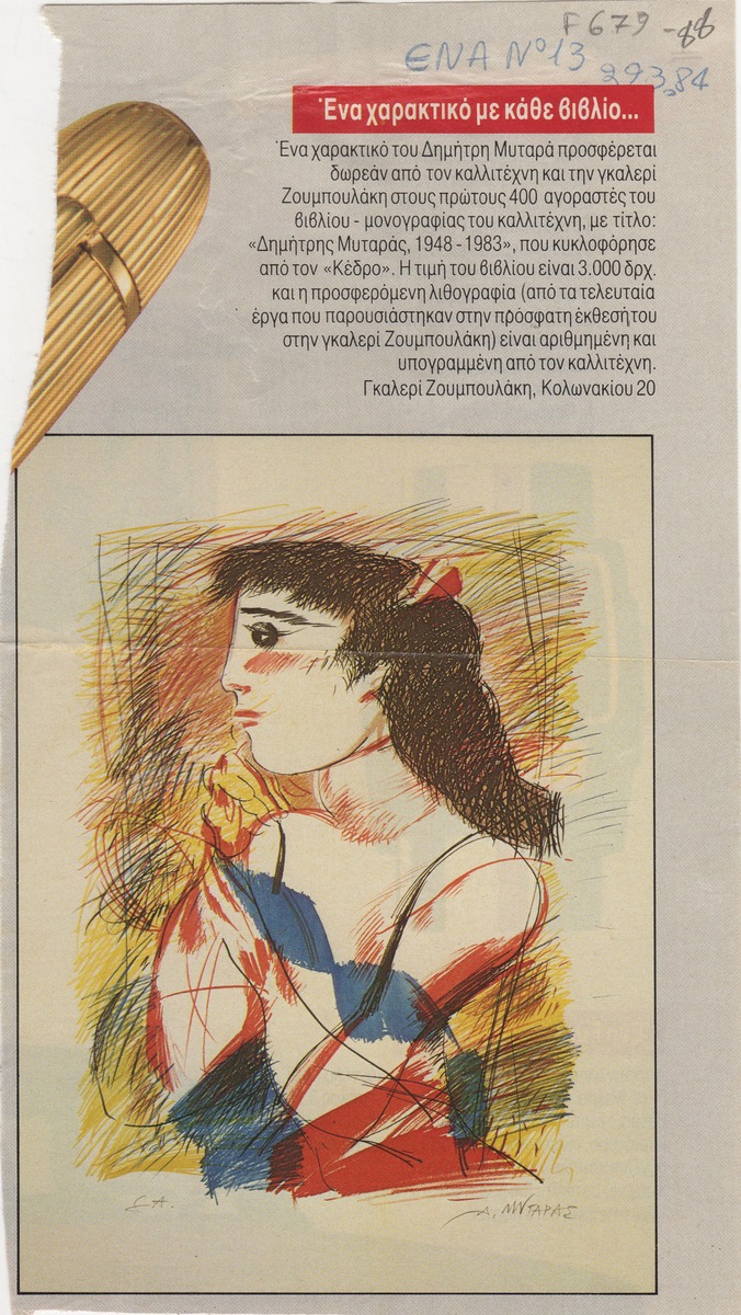 “An excerpt from the magazine “Ena”, dated March 29, 1984, featuring an article about the donation of one of Dimitris Mytaras’s engravings with the purchase of a copy of his latest book, published by “Kedros’.