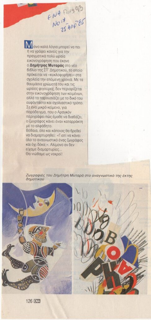 An excerpt from the magazine “Ena” dated April 25, 1985, featuring an article about the illustration of a 6th-grade textbook by painter Dimitris Mytaras.