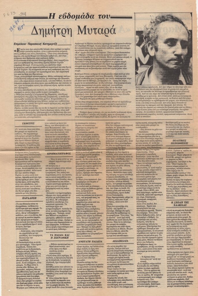 A clipping from the newspaper “I Avgi”, dated June 28, 1985, featuring an article about the views of the painter Dimitris Mytaras on exhibitions in Greece, folk tradition, cinema, teaching and education, politics and the School he has founded in the town of Chalkida (Greece).