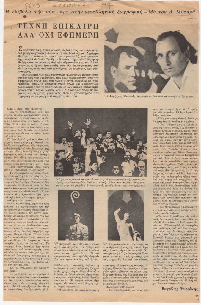 A clipping from the magazine “Eikones” featuring an interview with the painter Dimitris Mytaras, in which he talks about some of his works bearing influnces from the pop-art movement.