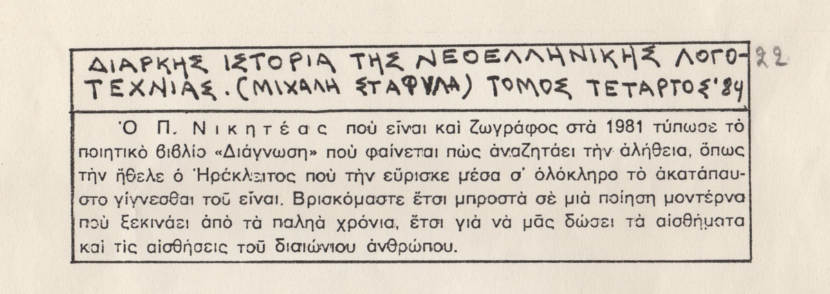 Νικητέας, Παναγιώτης, "Διάγνωση", Αθήνα, 1981.,Σταφυλάς, Μιχάλης, "Διάρκης ιστορία της νεοελληνικής λογοτεχνίας", τομ. Δ', 1984.