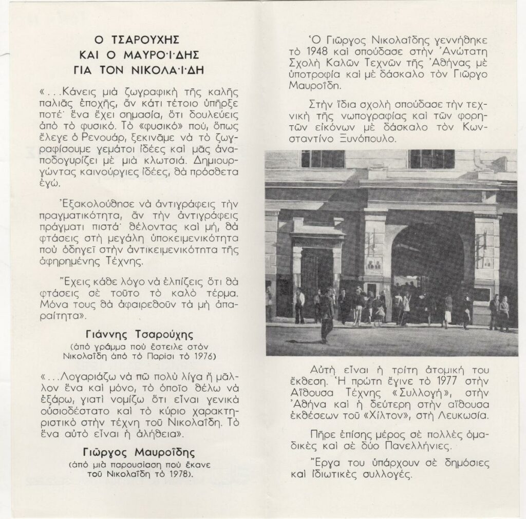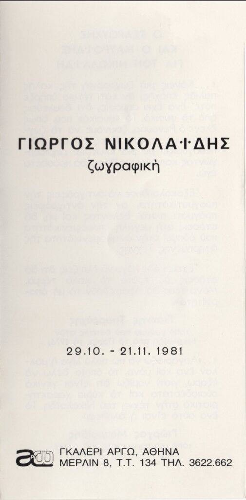 Brochure for the solo painting exhibition of Georgios Nikolaidis at the “Argo” Gallery in Athens. It contains reviews by Giannis Tsarouchis and Giorgos Mavroeidis.