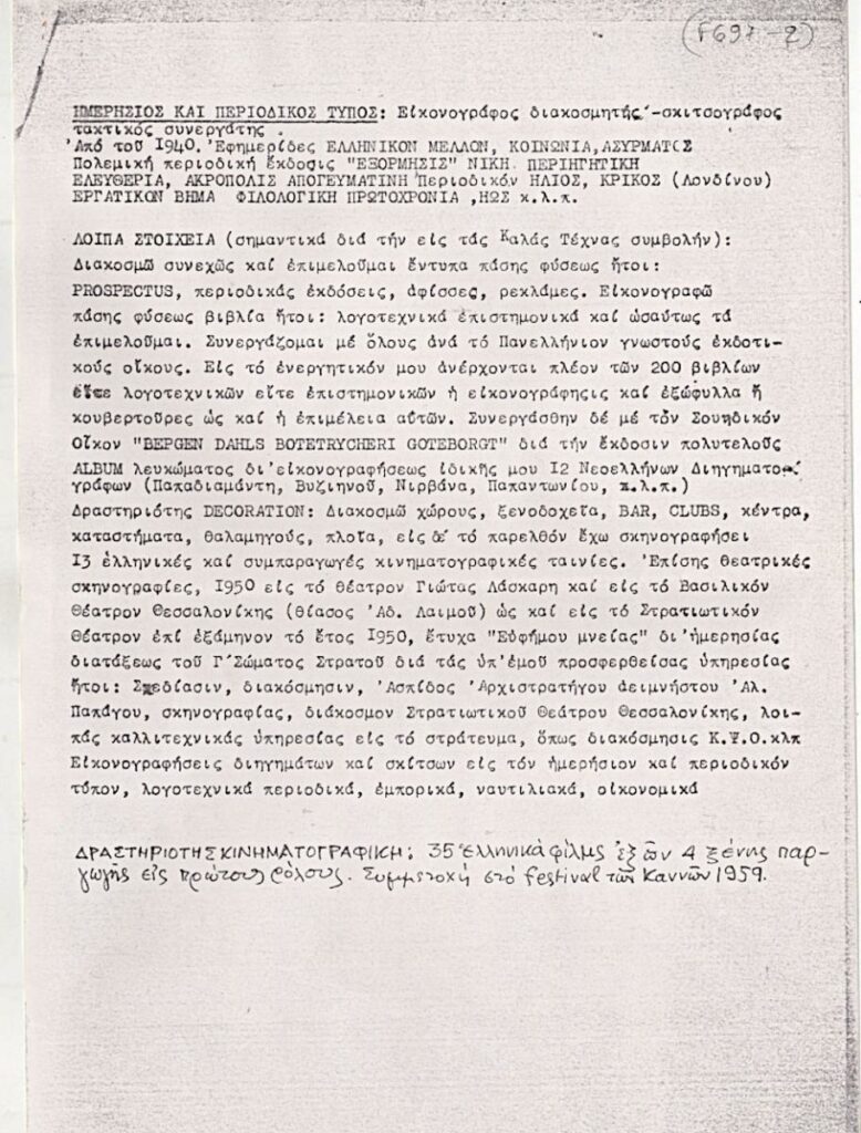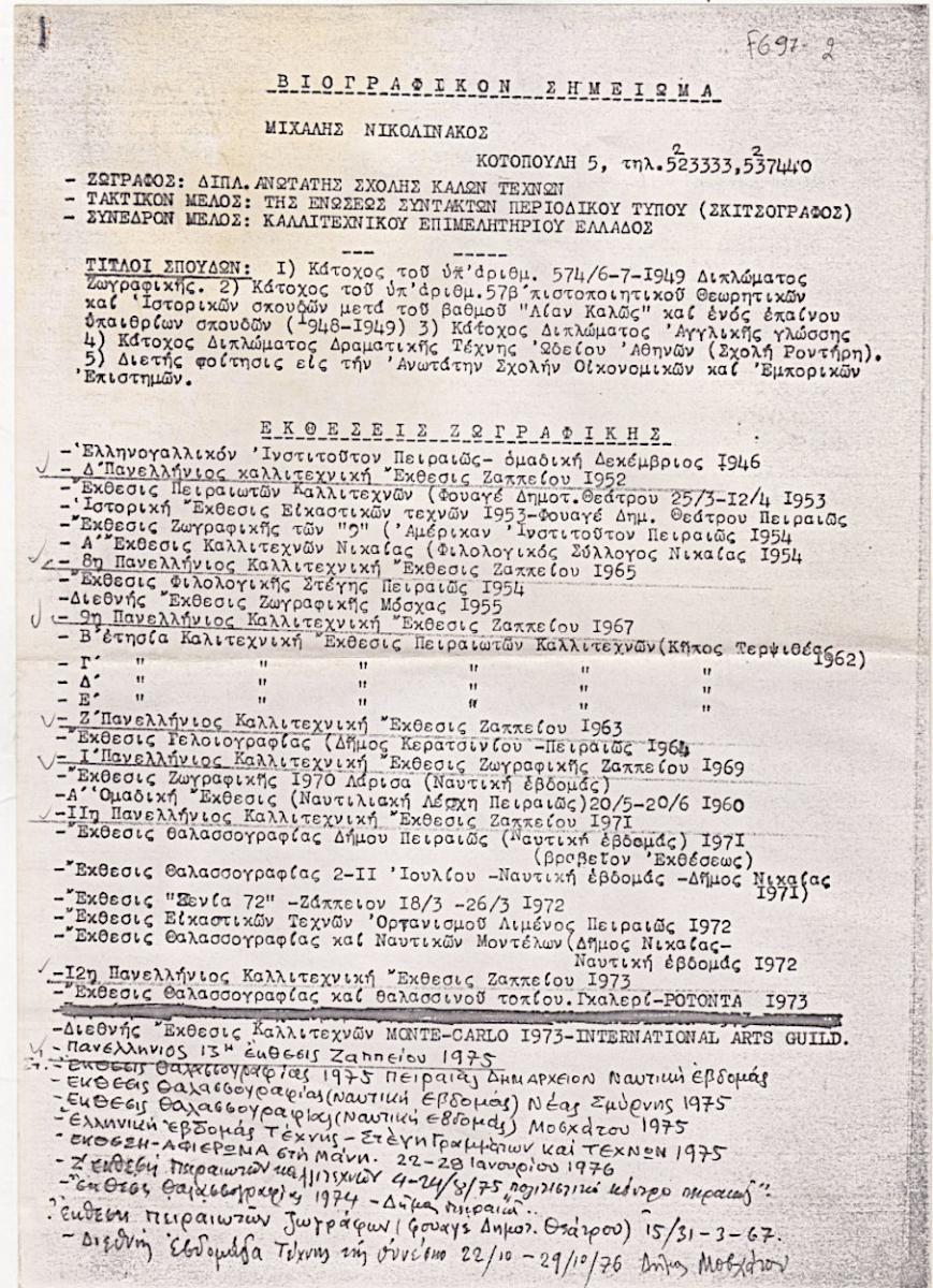 Photocopy of the typewritten curriculum vitae of the Greek artist Michalis Nikolinakos. It includes education, a list of exhibitions, publications in the press, and various other information about his artistic activity.