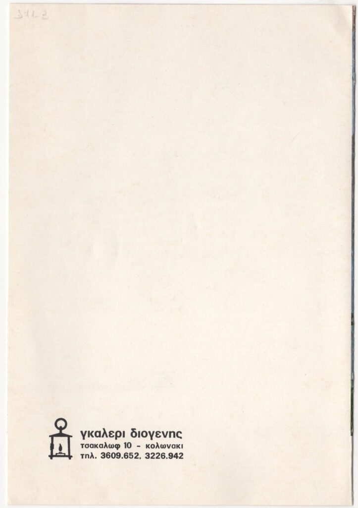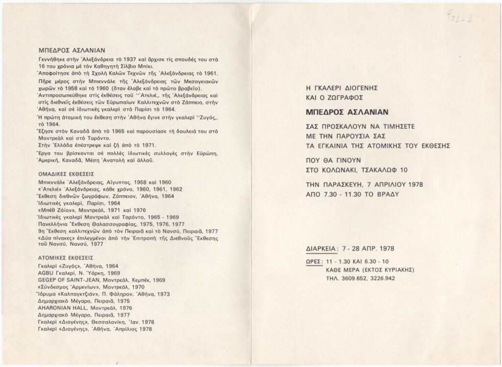 Poster for Bedros Aslanian’s solo exhibition held at the “Diogenes’ Art Gallery in Athens. It includes the artist’s biographical note, a list of his exhibitions, and a commentary by B. A. Kountouridis.
