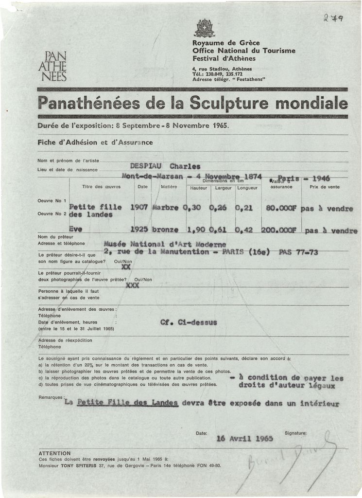 Spiteris Tonis (1910 - 1986) ; Calder Alexander (1898 - 1976) ; Rodin Auguste (1840 - 1917) ; Moore Henry (1898 - 1986) ; Jean Arp (1886 - 1966) ; Jacques Lipchitz ; Lipsi, Morice (1898 - 1986) ; Laurens Henri (1885 - 1954) ; Marino Marini (1901 - 1980) ; Aristide Maillol (1861 - 1944) ; Meštrović Ivan (1883 - 1962) ; Noguchi, Isamu (1904 - 1988) ; Richier Germaine (1904 - 1959) ; Giacometti Alberto (1901 - 1966) ; Zadkine Ossip (1890 - 1967) ; Duchamp-Villon Raymond (1876 - 1918) ; Charles Despiau (1874 - 1946) ; Ángel Ferrant Vázquez (1890 - 1961) ; Freundlich, Otto (1878 - 1943) ; Gonzalez Julio (1876 - 1942) ; Gargallo Pablo (1881 - 1934) ; Gaudier-Brzeska Henri (1891 - 1915) ; Naum Gabo ; Lehmbruck Wilhelm (1881 - 1919) ; Charles Malfray ; Pevsner Antoine ; Rosso Medardo (1858 - 1928) ; Sesostris Vitullo ; Barlach Ernst (1870 - 1938) ; Bill, Max (1908 - 1994) ; Boccioni Umberto (1882 - 1916) ; Pablo Curatella Manes ; Brancusi Constantin (1876 - 1957) ; Alexander Archipenko (1887 - 1964) ; Bourdelle Antoine (1861 - 1929) ; Peyrissac Jean (1895 - 1974) ; Pompon François (1885 - 1933) ; Csaky Joseph (1888 - 1971) ; Wotruba Fritz (1907 - 1975) ; Henri Hamm ; Prinner Anton (1902 - 1983) ; Ralph Stackpole ; Jean Chauvin ; Honorio Garcia Condoy ; Gaston Lachaise