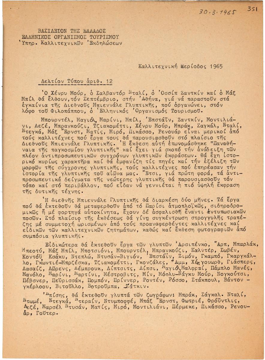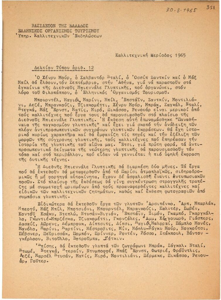 Press release of the 1st World Exhibition “Panathenaea of Contemporary Sculpture” held in Athen. It includes the names of the participating artists and of those attending the opening ceremony of the exhibition.