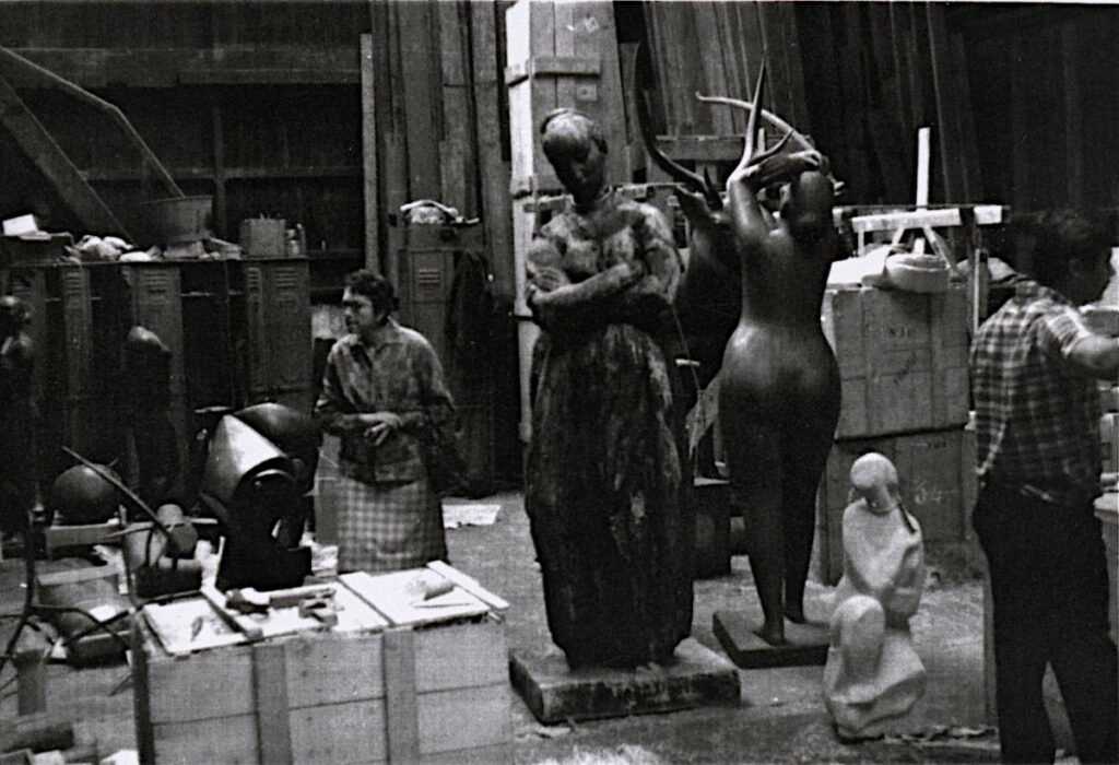 A black-and-white printed photograph of Ioanna Spiteri, among works collected for the Panathenaic World Sculpture event. On the reverse, inscriptions.