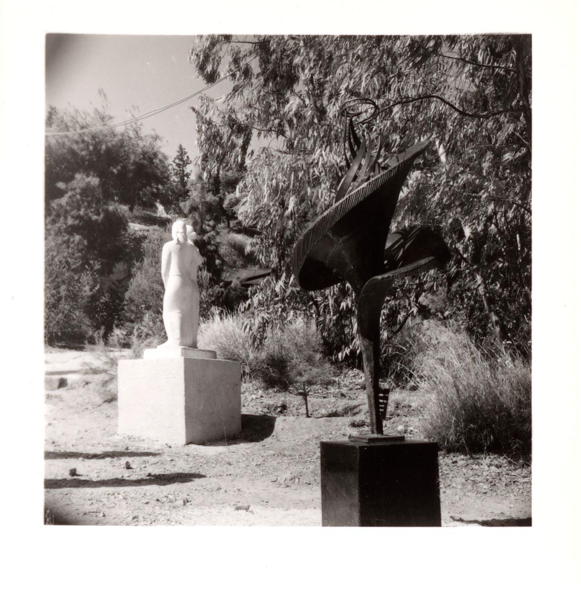 Black-and-white printed photograph of two artworks by Michalis Tombros and Froso Eftymiadi-Menegaki, which was presented at the 1st World Exhibition “Panathenaea of Contemporary Sculpture” athens.